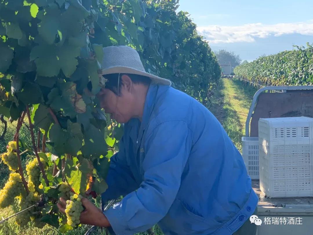 823日,天晴的像一張藍紙,幾片薄薄的白云,像被陽光曬化了似的,隨風緩緩浮游著,就是在這樣一個如詩如畫的日子里,格瑞特酒莊一年一度的葡萄采收工作正式拉開了帷幕。最先和我們見面的霞多麗葡萄,在柔和的陽光下,顯得格外美!